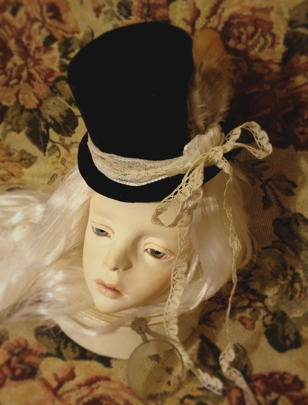 アンティークレースと飾りの羽根がポイント。